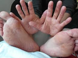 English Español Português Français Italiano Svenska Deutsch. Nach drei bis zehn Tagen Inkubationszeit beginnen Ausschlag und Fieber. Danach entstehen rote Flecken auf den Handinnenflächen den Fußsohlen um den Mund herum sowie im Mund.